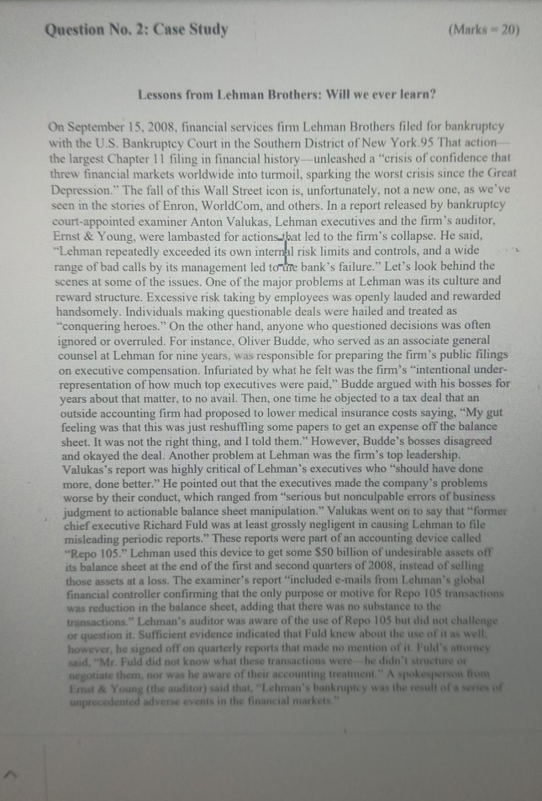 The Question Relates To Lehman Brothers Case Chegg Com